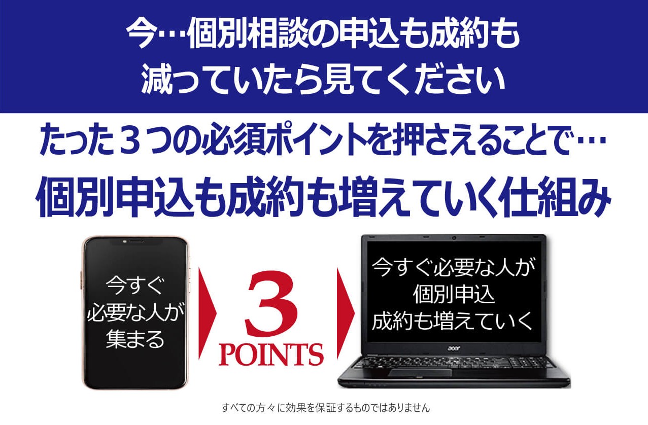一方、個別申込も成約も増やし続けている…ごく少数は、たった3つの必須ポイントを押さえた「仕組み」を持っています。それは…